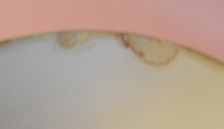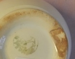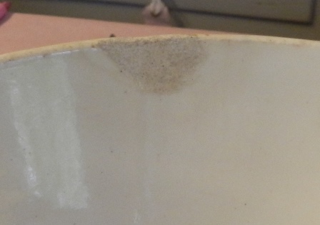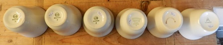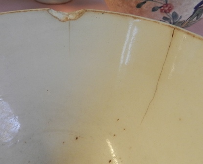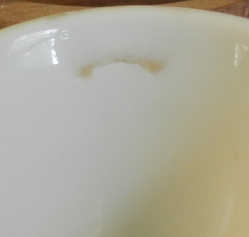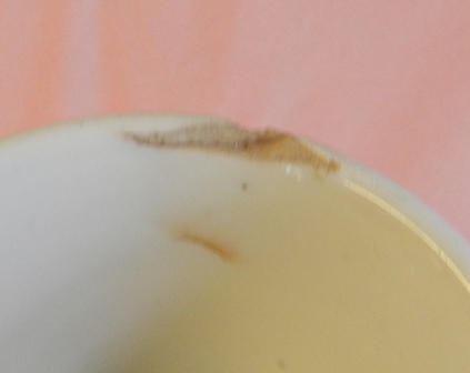 Kaffe og croissant tid, så kan der drikkes og dyppes. Den til venstre har en hårfin revne og den til højre et skår i kanten og en hårfin revne.