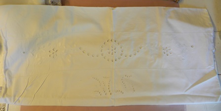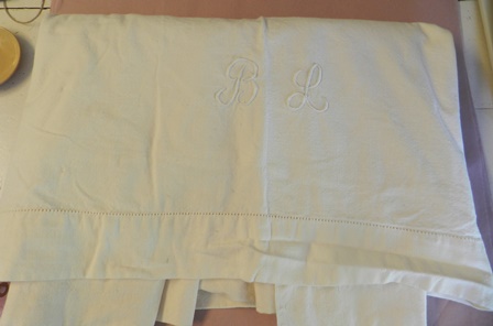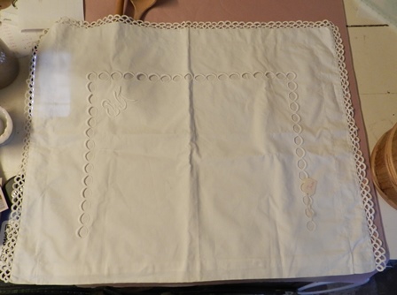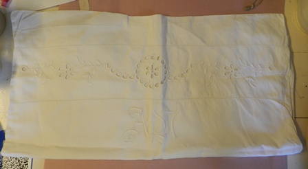 Smuk gammelt overslag med stort monogram og lækker bred bord af mellemværk.